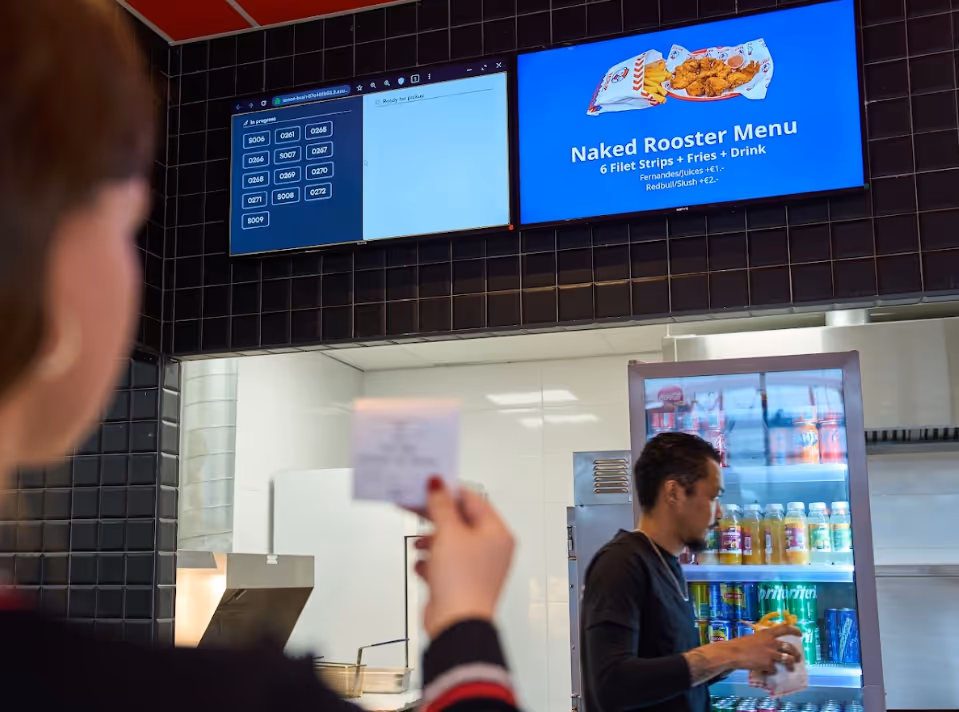 Chaos tijdens het uitgeven van bestellingen kan je voorkomen door het gebruik van een pick-up scherm. Zodra een bestelling klaar is, verschijnt deze automatisch op het scherm voor de gast, zonder dat er geroepen hoeft te worden of zonder dat er papieren bonnen nodig zijn. Dit zorgt voor overzicht, rust en een snellere afhandeling.
